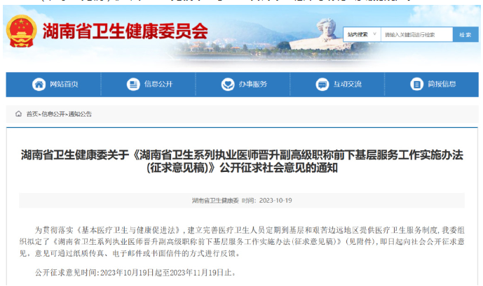 10月19日,湖南卫健委发布关于《湖南省卫生系列执业医师晋升副高级职称前下基层服务工作实施办法(征求意见稿)》,征求意见稿中对于医生晋升下基层,予以了明确的规定。