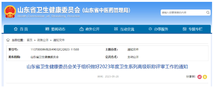 山东省卫生健康委员会发布了《山东省卫生健康委员会关于组织做好 2023 年度卫生系列高级职称评审工作的通知》。