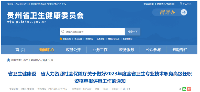 2023年7月27日,贵州省卫健委下发了《关于做好2023年度全省卫生专业技术职务高级任职资格申报评审工作的通知》。