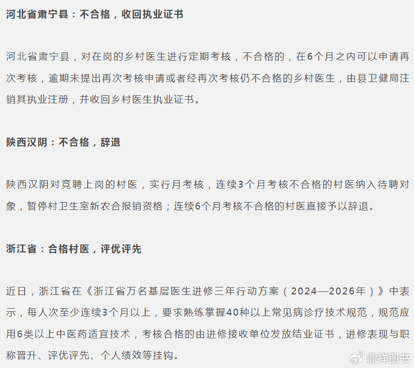 村医执业标准严格、专业化,已成大趋势。各省针对乡村医生执业标准和规范都做出不同程度的要求,比如: