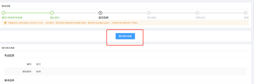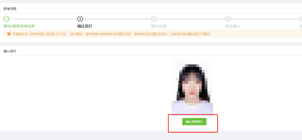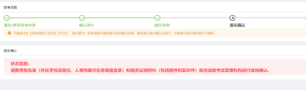 通过现场确认后,相关部门会对考生的资格进行审核,资格审核通过后,考生管理平台中报考流程中“资格审核”步骤会变为绿色,请关注报名状态。
