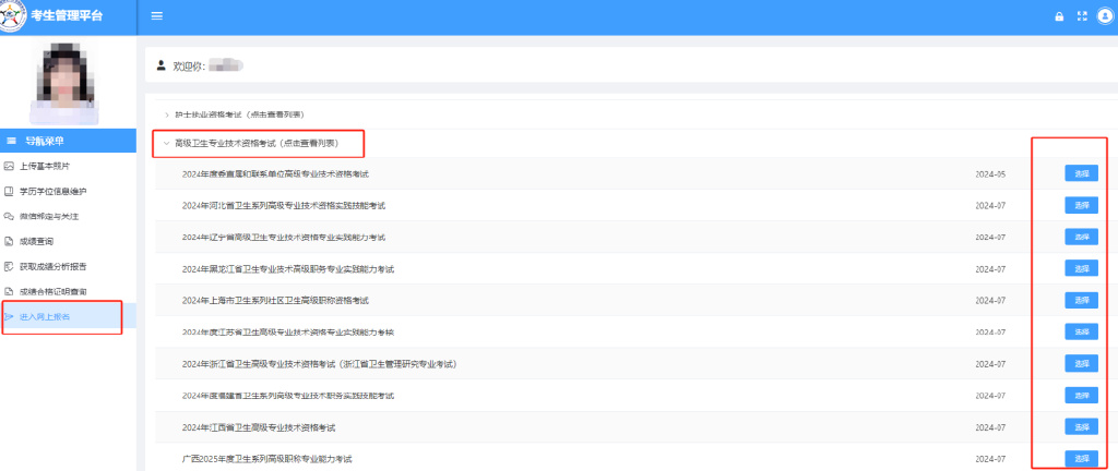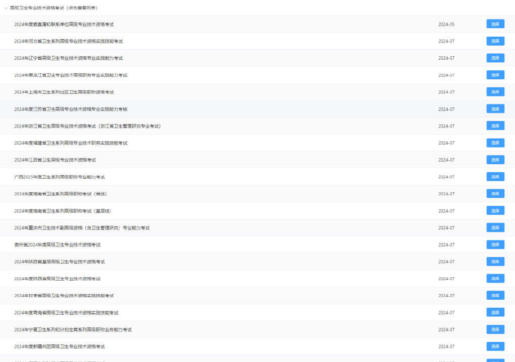 4、点击【进入网上报名】,选择高级卫生专业技术资格考试,选择相应省份。
